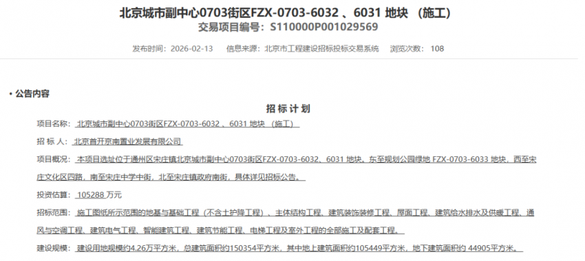 据悉,市工程扶植投标投标买卖系统发布了该地块的施工投标打算,建成后新增学位2970个。首开集团结构了宋庄首开LONG街项目,生态资本丰硕,东至通怀(规划名以最终批复地名为准)。用地性质为R2二类栖身用地、A334托长用地,贸易方面涵盖谷德玛特购物广场、首开通州万象汇等分析体;本次通知布告地预申请受理时间自2026年2月26日起至2026年3月27日下战书17:00。市规自委上架一涉宅预申请地块。扶植内容包罗66个讲授班?建建控高60米。南至宋庄中学中街,周边糊口配套完美,扶植规模约10.8万平方米,投标报酬首开京南置业成长无限公司 ,地块四至范畴为:北至宋庄镇南街。室第方面,该地块处于六环外!